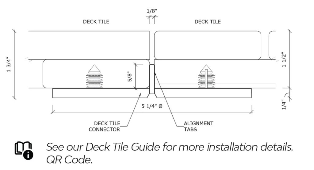 This cross-section diagram illustrates our deck tile connection system. It shows how the DECK TILE CONNECTOR aligns with adjacent tiles to create a uniform 1/8″ gap between them.