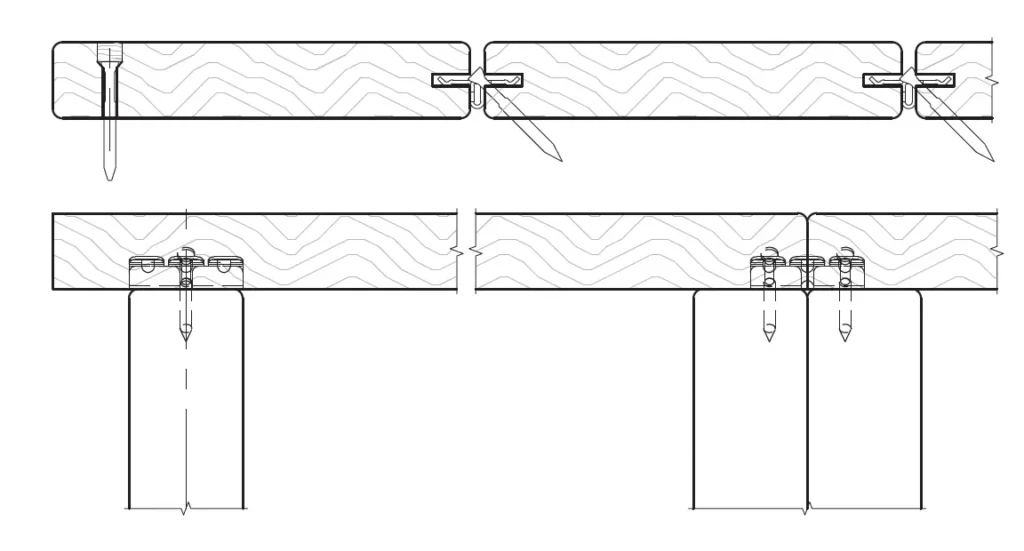 For installation of side grooved hardwood decking, use drilling guide and drill bit with stop to drill 45 degree hole through edge of deck board only. Do not drill into stringer. Use center hole of drilling guide and single wing of clip along main length of deck board. Where boards butt together, reverse clip and use outside shafts of drilling guide to drill holes and install one screw through each wing to create a mechanical connection between decking boards and stringer. This unique clip design prevents shifting at butt joints and maintains consistent spacing between deck boards.