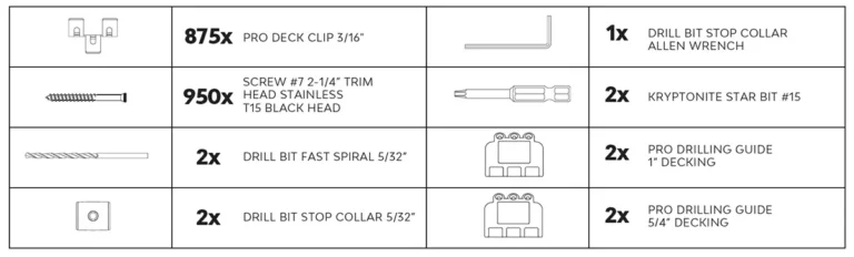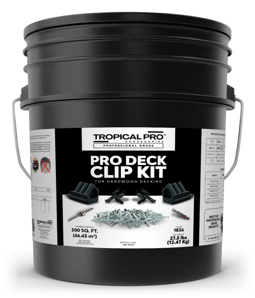 This Tropical Pro™ 500 sq. ft. Pro Deck Clip Kit contains the necessary hidden fasteners, screws, drill and driver bits to install 500 sq. ft. (46.45 m2) of 6″-wide (140mm) Tropical Pro™ deck boards onto stringers spaced 16 inches (40.6 cm) on center. Use in combination with other Tropical ProTM Decking and Cladding Products. Always make sure to review our Tropical Pro™ Best Practices Guide to achieve the best possible outcome and service life of your deck or cladding installation and to protect your investment over time.