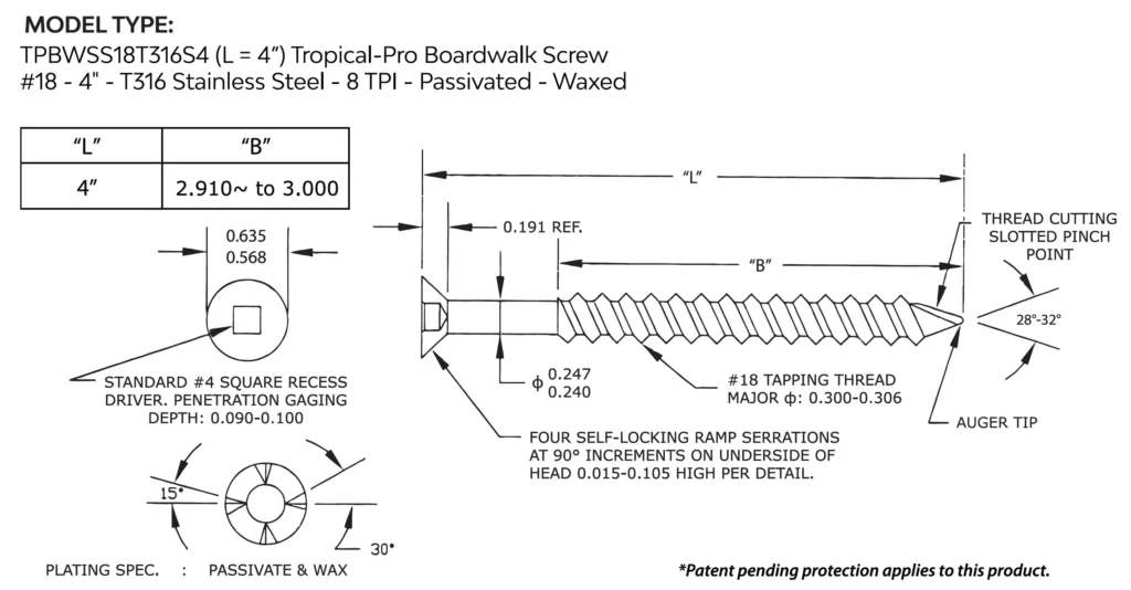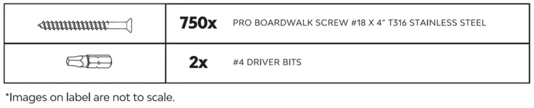 Tropical Pro™ Professional Grade Boardwalk Screw #18 X 4” T316 Stainless Steel should be used when face fastening 2” (net 1.5” / 38mm) hardwood or softwood decking to treated wood or hardwood stringers.