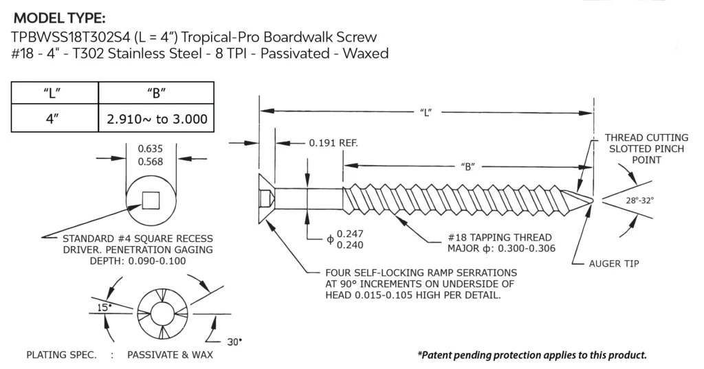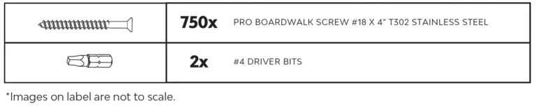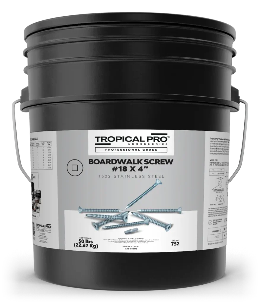 Tropical Pro™ Professional Grade Boardwalk Screw #18 X 4” T302 Stainless Steel should be used when face fastening 2” (net 1.5”/ 38mm) hardwood or softwood decking to treated wood or hardwood stringers.