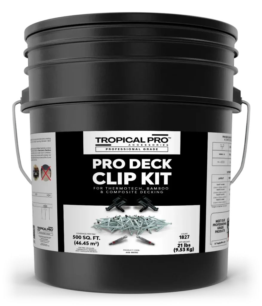 This Tropical Pro™ 500 sq. ft. Pro Deck Clip Kit contains the necessary hidden fasteners, screws and driver bits to install 500 sq. ft. (46.45 m2) of 6″-wide (net 5.5”/140mm) Thermotech, Bamboo or Composite deck boards onto stringers spaced 16 inches (40.6 cm) on center. Use in combination with other Tropical Pro Decking and Cladding Products. Always make sure to review our Tropical Pro™ Best Practices Guide to achieve the best possible outcome and service life of your deck or cladding installation and to protect your investment over time.