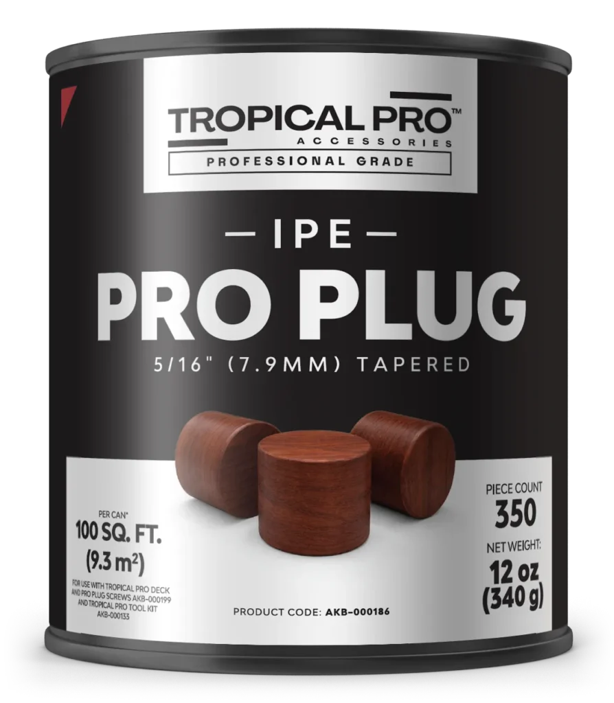 Tropical Pro Professional Grade Pro Plugs are made from face grain wood. They are tapered, for ease of installation and sit flush with the deck surface when used with the Tropical Pro Professional Grade Pro Plug Bit and Glue Nozzle, which can be found in our Tropical Pro Plug Kits, Tropical Pro Plug Tool Kit and Tropical Pro Master Tool kit.