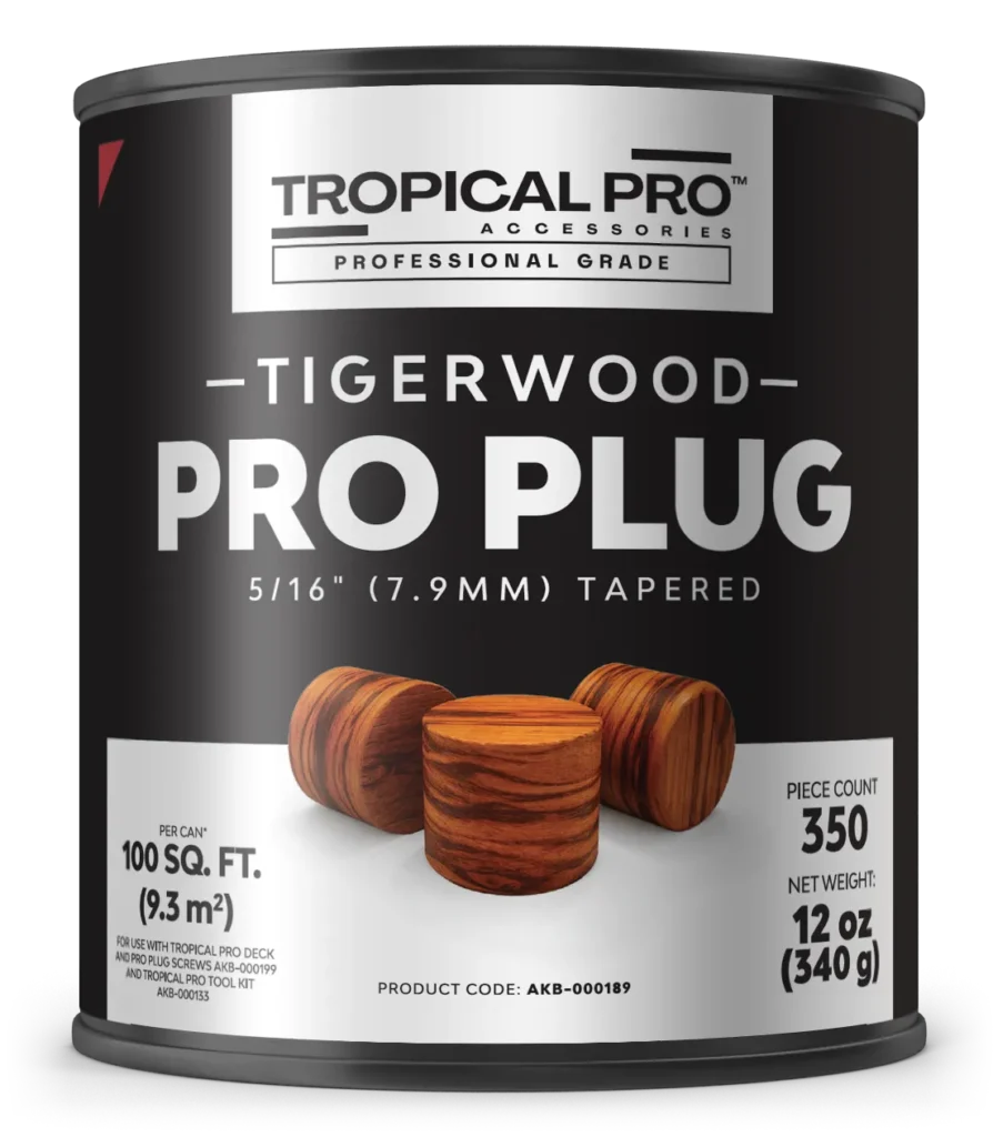 Tropical Pro Professional Grade Pro Plugs are made from face grain wood. They are tapered, for ease of installation and sit flush with the deck surface when used with the Tropical Pro Professional Grade Pro Plug Bit and Glue Nozzle, which can be found in our Tropical Pro Plug Kits, Tropical Pro Plug Tool Kit and Tropical Pro Master Tool kit.