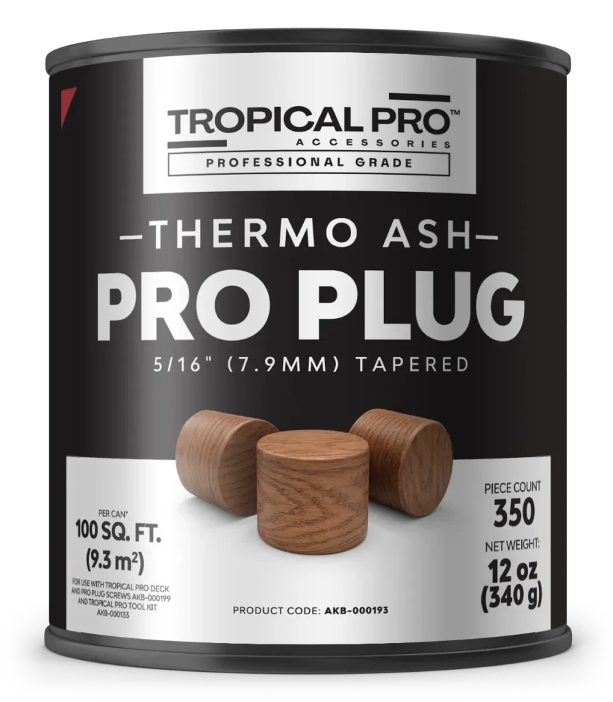Tropical Pro Professional Grade Pro Plugs are made from face grain wood. They are tapered, for ease of installation and sit flush with the deck surface when used with the Tropical Pro Professional Grade Pro Plug Bit and Glue Nozzle, which can be found in our Tropical Pro Plug Kits, Tropical Pro Plug Tool Kit and Tropical Pro Master Tool kit.