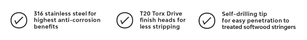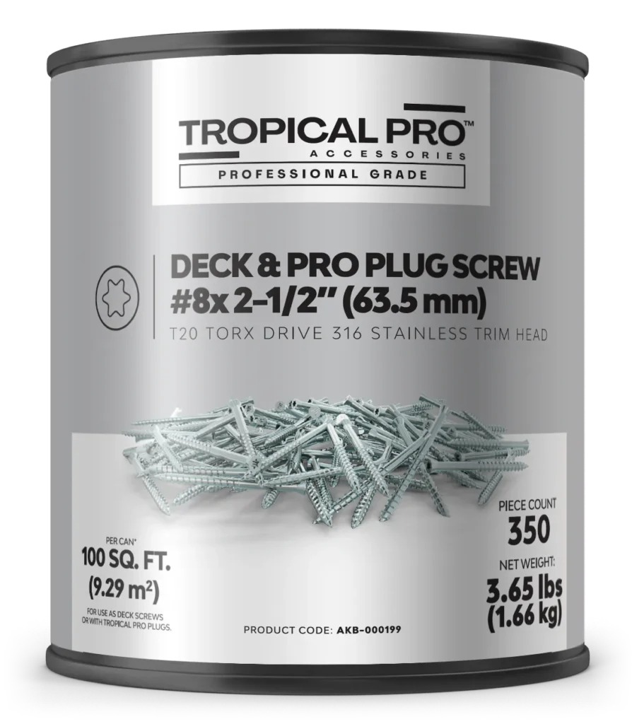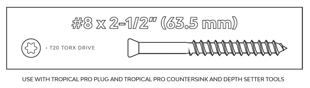 Tropical Pro™ Professional Grade Deck Screw #8×2-1/2″ (63.5 mm) T20 Torx Drive Head 316 Stainless should be used when face screwing Tropical Pro™ 1″ (25.4 mm) or 5/4″ (18.1 mm) decking to treated stringers and when intending wood to weather to a silver-grey patina or with Tropical Pro Plugs and Tropical Pro Plug Tool Kit. Hardwood decking should always be predrilled and countersink when face fastening.